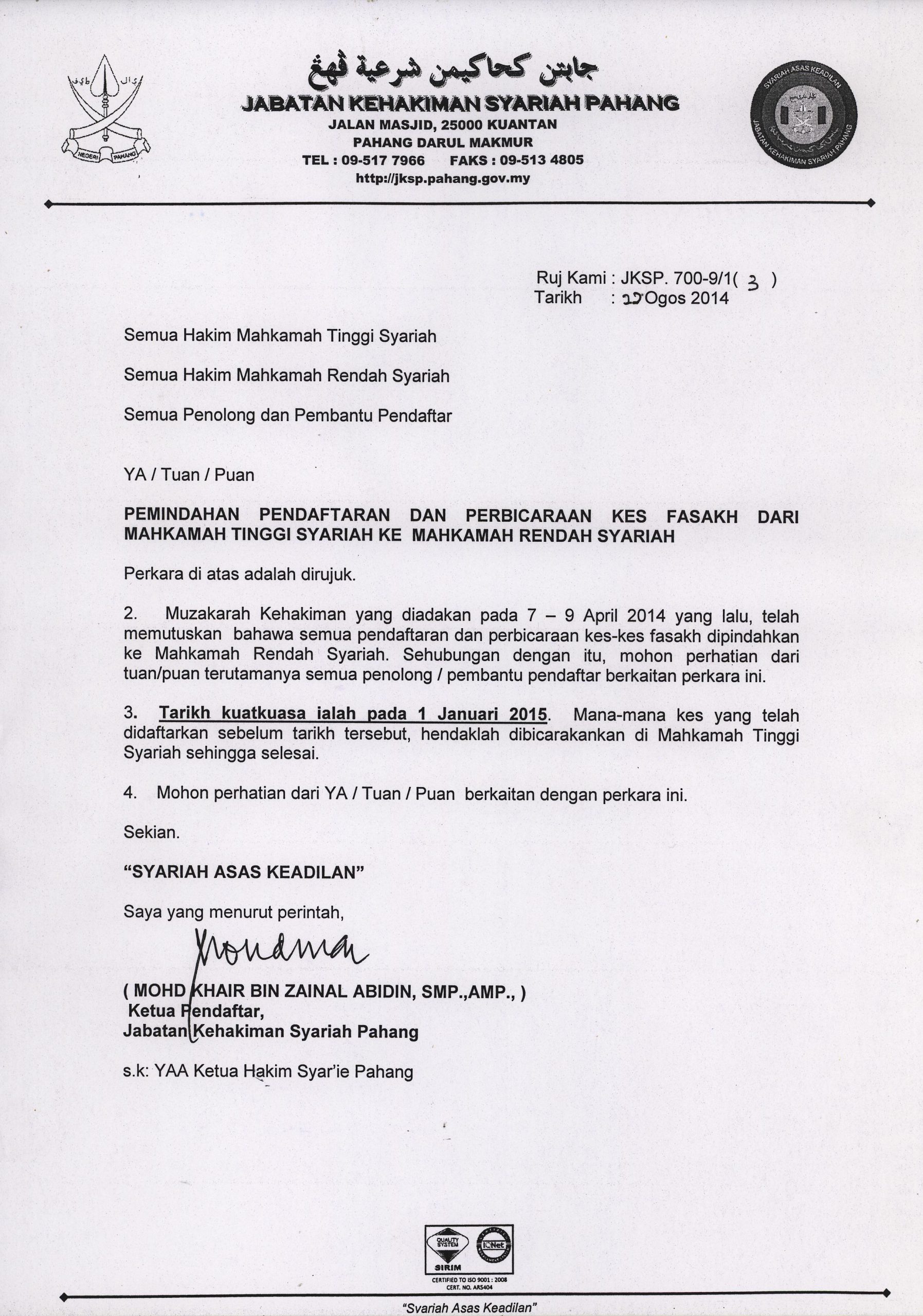 Pemindahan Bidang Kuasa Pendaftaran dan Perbicaraan Kes Fasakh